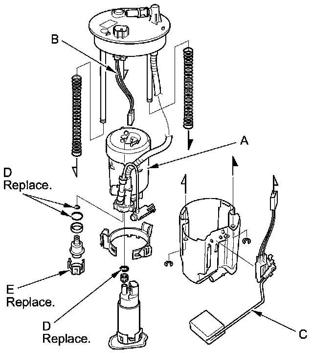 4. Install the parts in the reverse order of removal with new O-rings (D) and a new bracket (E). When installing the fuel tank unit, align the marks on the unit and the fuel tank.