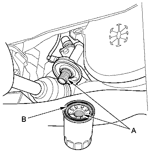 4. Inspect the threads (A) and the rubber seal (B) on the new filter. Clean the seat on the oil filter base, then apply a light coat of new engine oil to the filter rubber seal. Use only filters with a built-in bypass system.