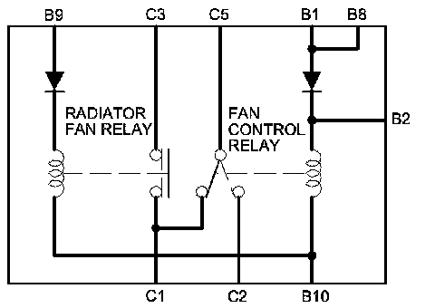 There should be continuity between terminals C2 and C5 when battery power is connected to terminal B1 (, B2 or B8), and battery ground is connected to terminal B10. There should be continuity between terminals C1 and C5 when power is disconnected.