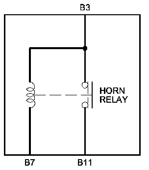 There should be battery voltage at terminal B11 when battery power is connected to terminal B3, and battery ground is connected to terminal B7. There should be no continuity between terminals B3 and B11 when power is disconnected.