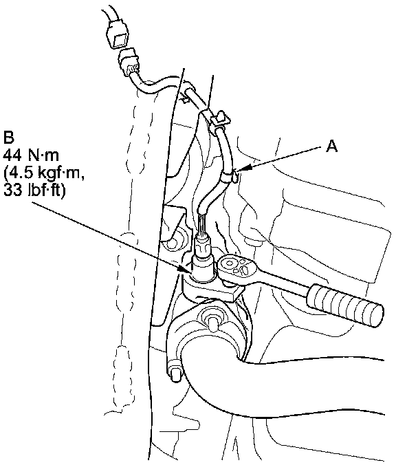 2. Disconnect the front secondary HO2S 4P connector (A), and remove the harness clamp (B).