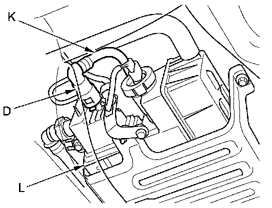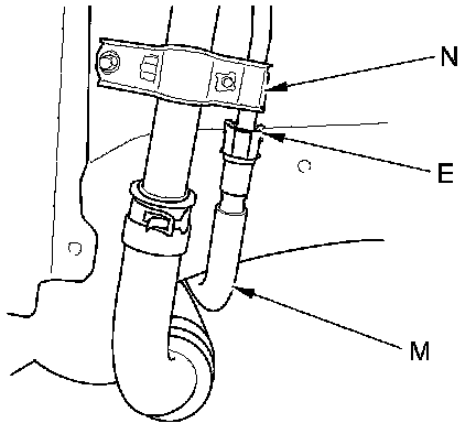 The fuel line/quick-connect fittings (A, B, C, D, and E) connect the fuel joint hose (F) to the fuel feed hose (G), the fuel feed hose to the fuel line (H), the fuel line (I) to the fuel tank unit (J), the fuel vapor line (K) to the EVAP canister (L), and the fuel tank vapor recirculation tube (M) to the fuel fill pipe (N). When removing or installing the fuel feed hose, the fuel tank unit, or the fuel tank, or when disconnecting or connecting the quick-connect fittings, pay attention to the following: