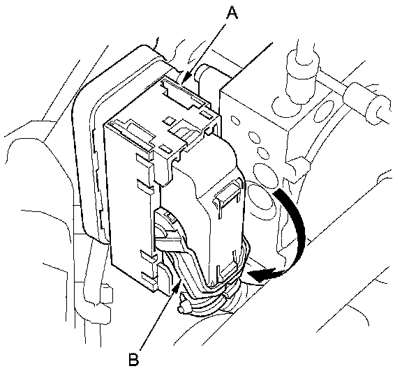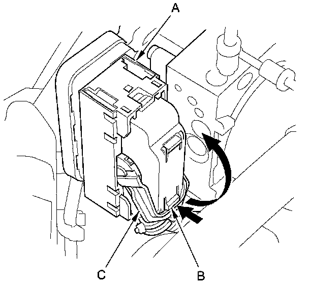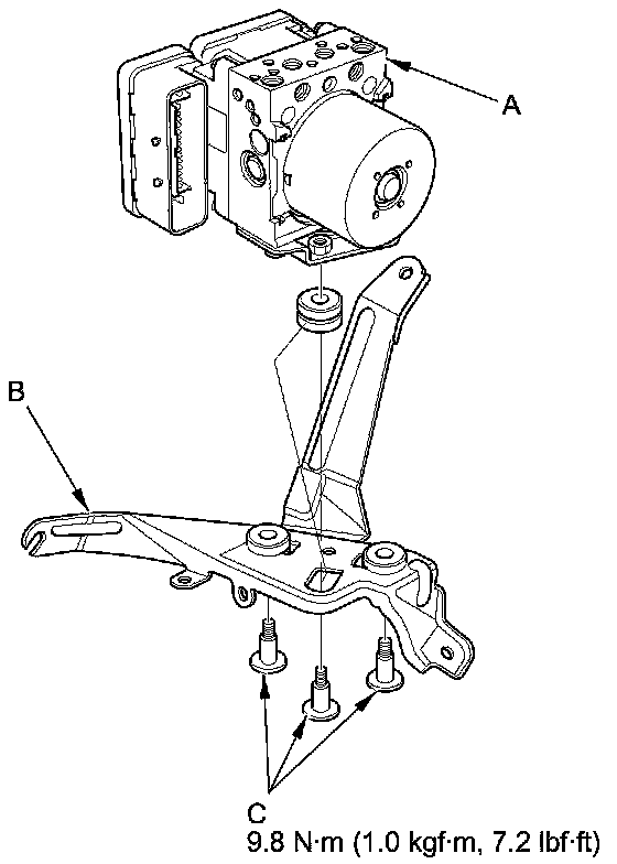 1. Install the VSA modulator-control unit (A) onto the bracket (B), then tighten the TORX bolts (C).