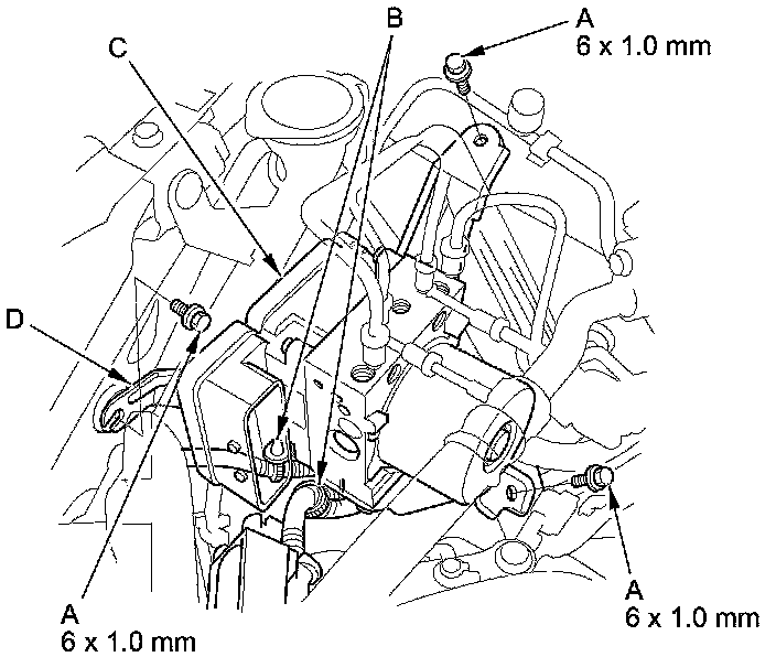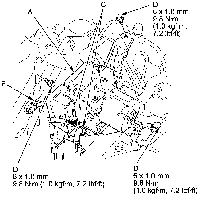 6. Remove the VSA modulator-control unit bracket mounting bolts (A) and the wire harness clips (B), then remove the VSA modulator-control unit (C) with the bracket (D) from the body.
