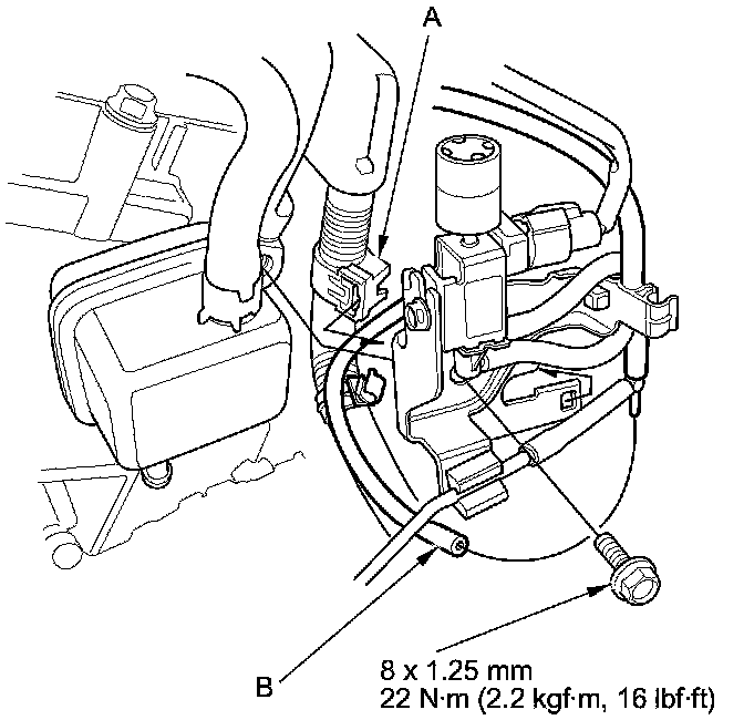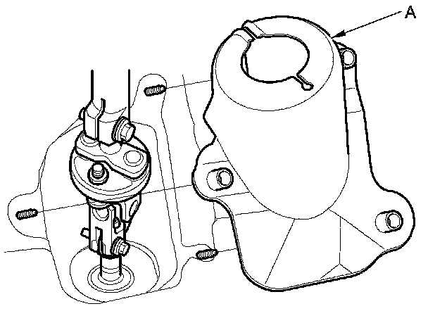 15. Remove the harness clamp (A), then remove the engine mount control solenoid valve bracket from the rear cylinder head; use the bracket bolt hole to attach the 2008 V6 attachment arm.