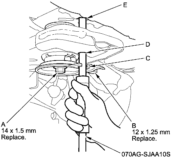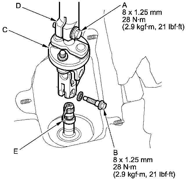 38. Loosely install the new right rear subframe mounting bolt (A) and the new stiffener mounting bolt (B); insert the 15.7 mm side of the subframe alignment pin (070AG-SJAA10S) through the positioning slot (C) on the rear stiffener, through the positioning hole (D) on the front subframe, and into the positioning hole (E) on the body, then tighten the right rear subframe mounting bolt.