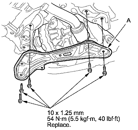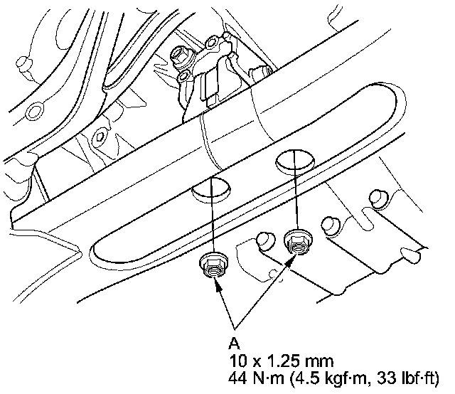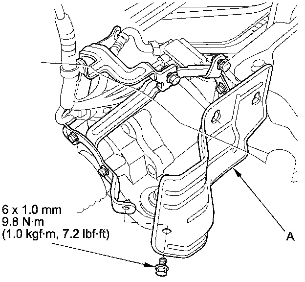 24. Remove the flange bolts, and remove the front subframe stiffener (A).