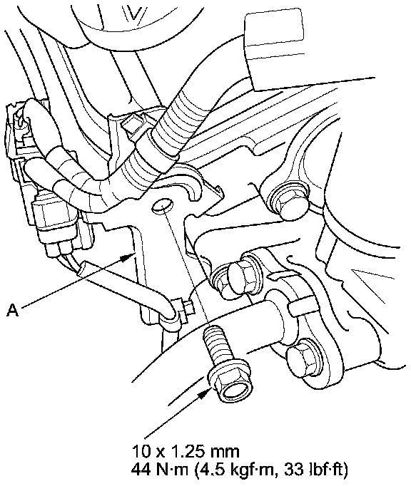 41. Tighten the right rear subframe mounting bolt (A) to the specified torque.