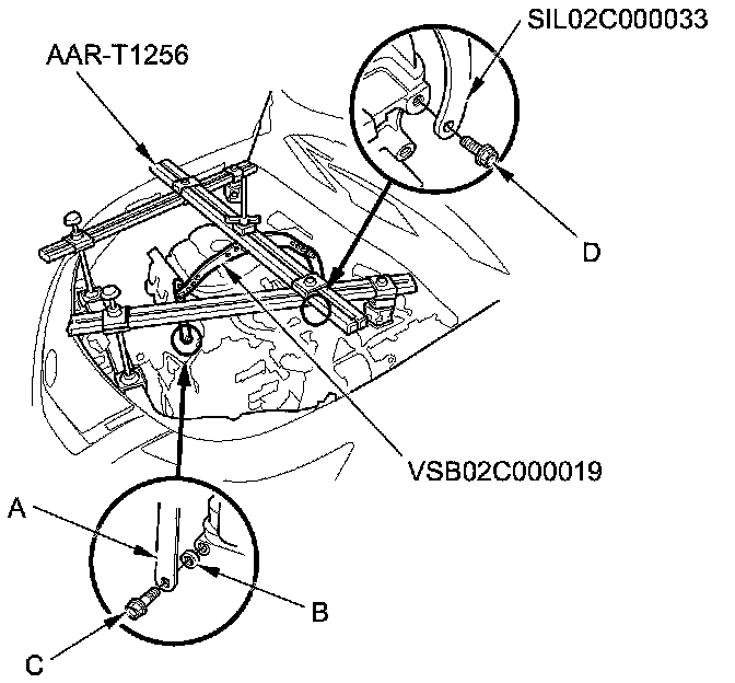 17. Lift and support the engine with the engine support hanger (AAR-T1256) and the engine hanger balance bar (VSB02C000019). Attach the front arm (A) to the front cylinder head with a spacer (B) and a 10 x 1.25 mm bolt (C). Remove the rear arm from the engine hanger balance bar, and install the 2008 V6 attachment arm (SIL02C000033), then attach the 2008 V6 attachment arm to the rear cylinder head with a 8 x 1.25 mm bolt (D).