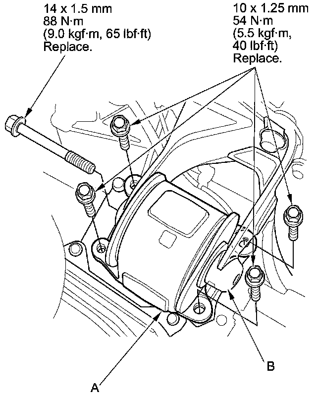 19. M/T: Remove the rear engine mount bolts from the rear engine mount (A) and the rear engine mount bracket (B).