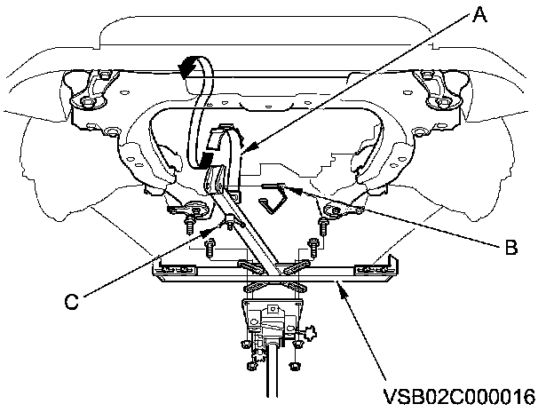 40. Loosely install the new subframe mounting bolt (A) and the stiffener mounting bolt (B) to both front stiffeners (C).