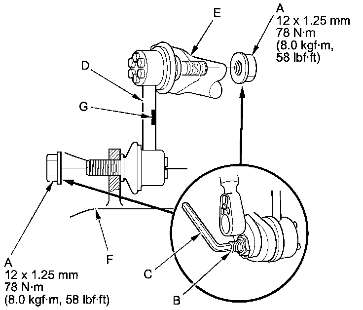 4. Install the stabilizer link on the stabilizer bar (E) and the lower arm (F) with the joint pins set at the center of their range of movement.