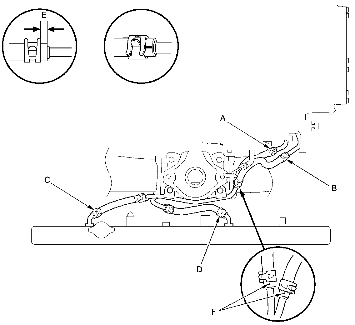 1. Install the ATF cooler hoses over the ATF cooler lines with the clips at the appropriate points in reference to the following list. Align the paint marks (F) facing the left of the vehicle.