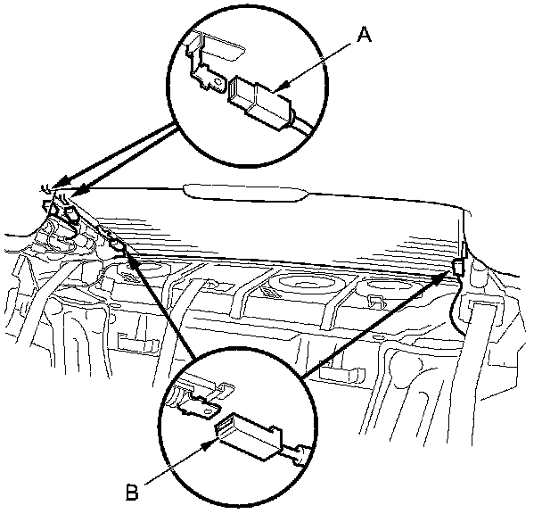 2. Disconnect the window antenna connectors (A) and the rear window defogger terminals (B).