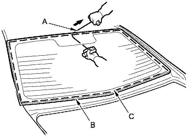 7. With a helper on the outside, pull the piano wire (A) back and forth in a sawing motion. Hold the piano wire as close to the rear window (B) as possible to prevent damage to the body, and carefully cut through the adhesive (C) around the entire rear window.