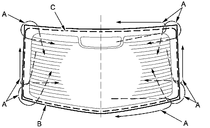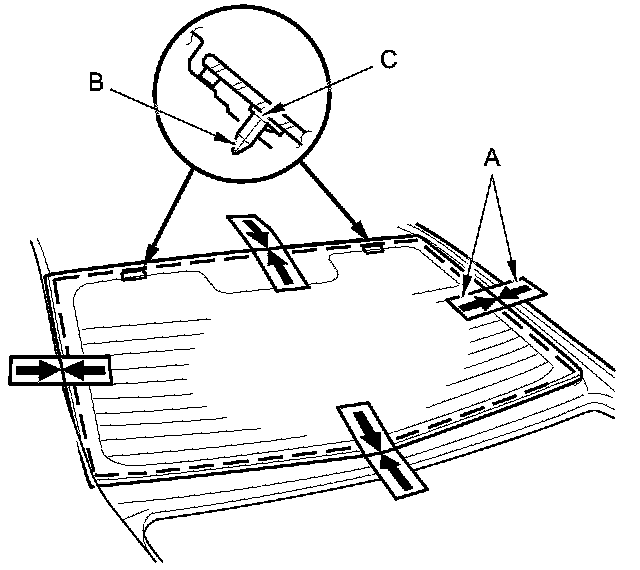 12. Apply glass primer to the edge of the rear window (A) where the lower rubber dam (B) will be attached as shown. Attach the lower rubber dam with adhesive tape (C) to the lower edge of the rear window: