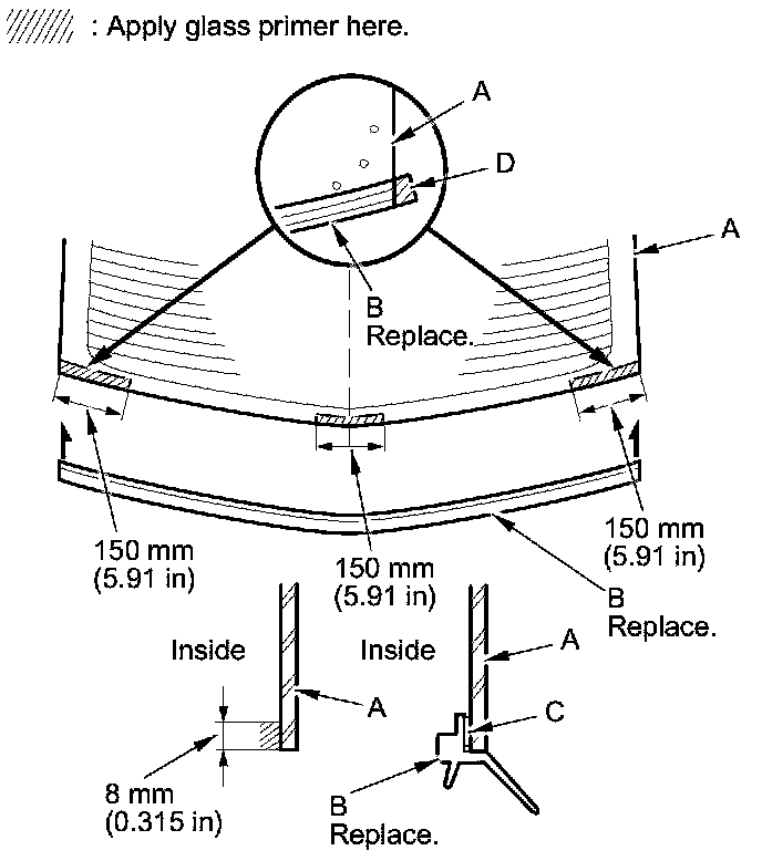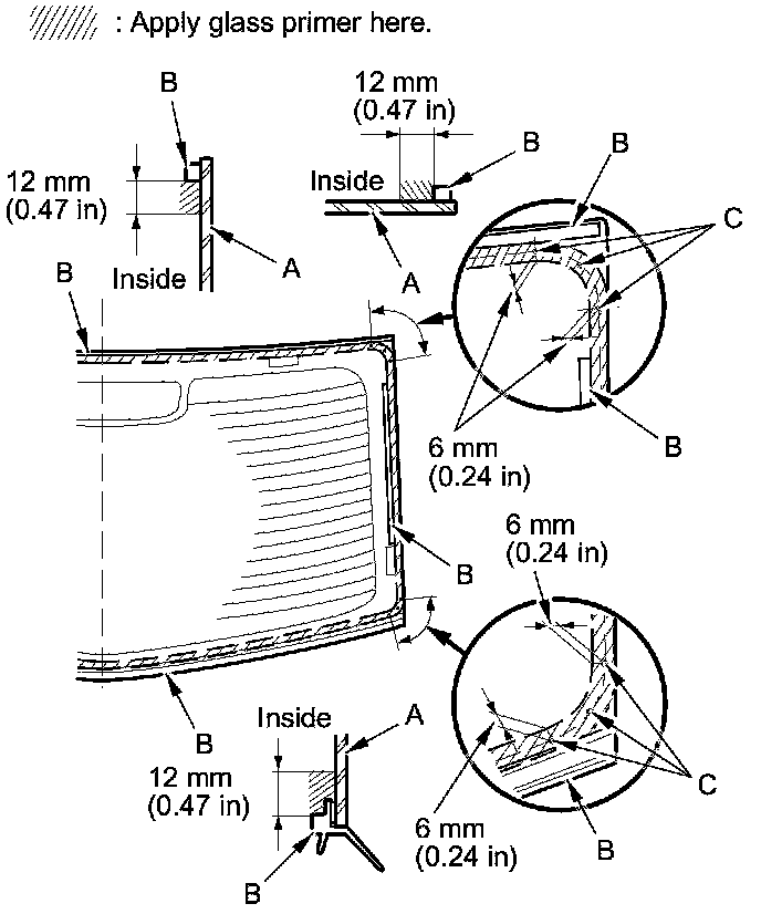 - Apply the glass primer to the corner areas of the rear window using the printed dots (C) on the rear window as a guide.