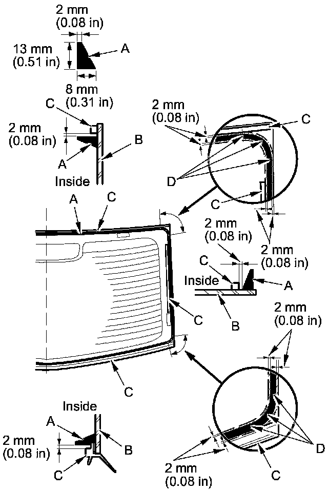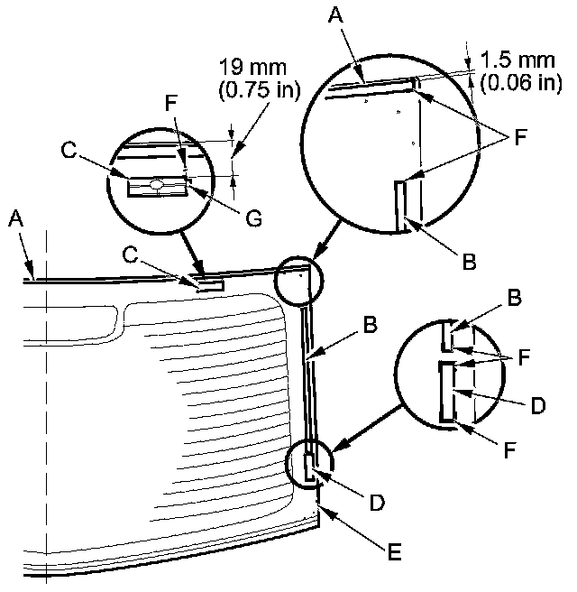 13. Apply glass primer to the upper clip mounting areas on the rear window, and let it dry. Attach the upper rubber dam (A), the side rubber dams (B), the upper clips (C), and the fasteners (D) with the adhesive tape to the inside face of the rear window (E) as shown: