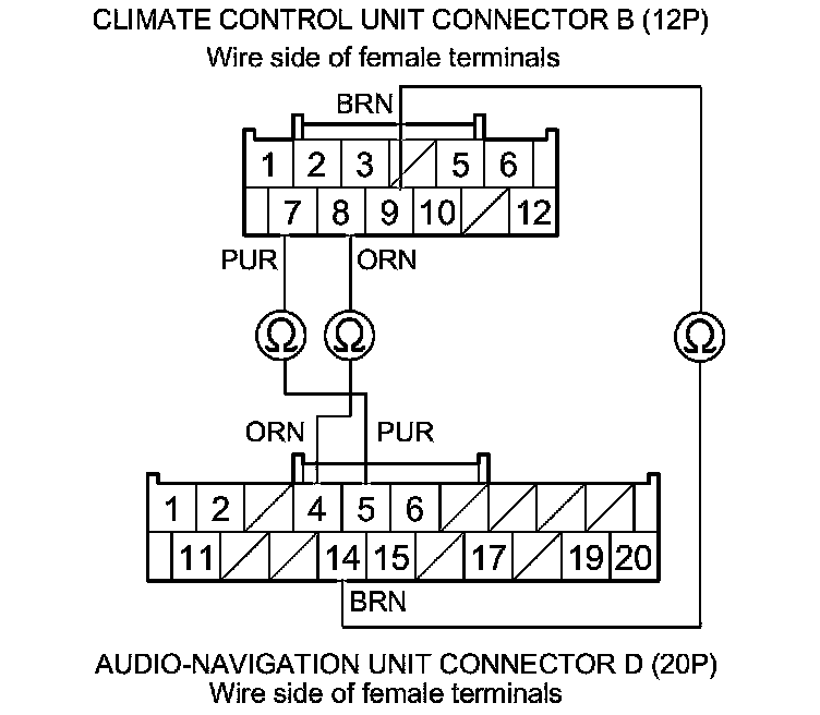 6. Check for continuity between the following terminals of climate control unit connector B (12P) and audio-navigation unit connector D (20P).