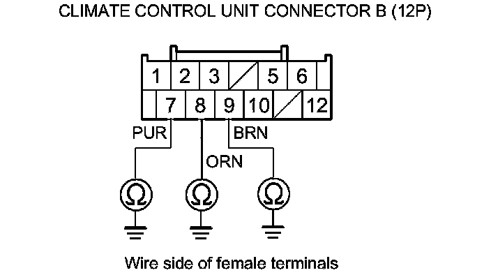 7. Check for continuity between body ground and climate control unit connector B (12P) terminals No. 7, No. 8, and No. 9 individually.