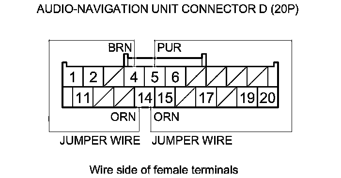 9. Connect the audio-navigation unit connector D (20P) terminals No. 4, No. 5, and No. 14 with jumper wires.