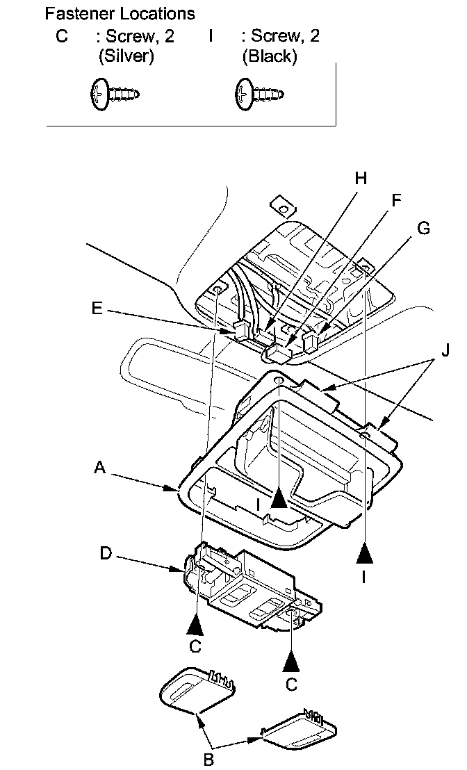 2. Remove the screws (C), then pull out the front individual map light (D).