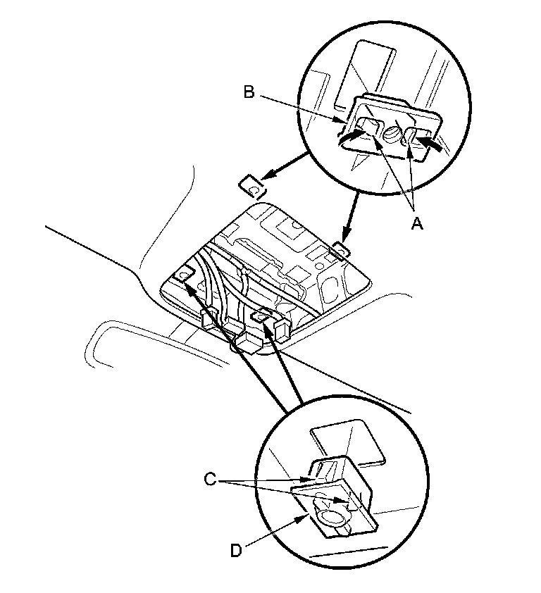 9. If necessary, release the hooks (C) by prying out the map light clips (D), then remove the clips.