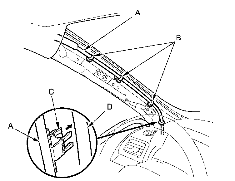 10. Remove the roof wire harness (A) by detaching the harness clips (B) from the driver's side A-pillar, and release the lowest clip (C) with a tube holder from the front moonroof drain tube (D).