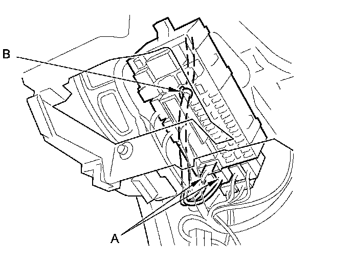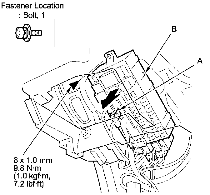 12. From under the driver's dash, remove the bolt, and release the hook (A), then move the driver's under-dash fuse/relay box (B).