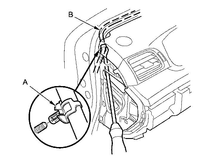 14. From outside of the driver's dash, carefully pry up on the roof wire harness holder (A) with a long-handled clip remover from the stud-bolt, then pull out the roof wire harness (B) from inside the dashboard.