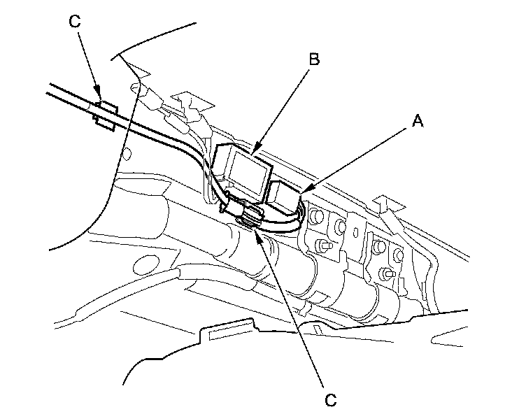 11. Remove the antenna lead (A) by detaching the harness clips (B) from the passenger's side A-pillar, and disconnect the antenna lead connector (C).