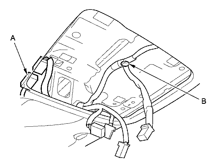 13. From under the driver's dash, disconnect the roof wire harness connectors (A), and detach the harness clip (B).