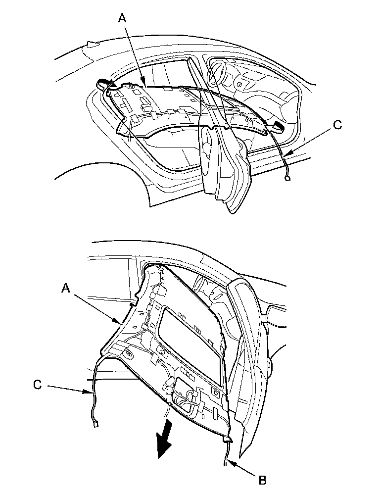 4. Pull the headliner along with the roof wire harness (B) and the antenna lead (C) out through the passenger's front door.