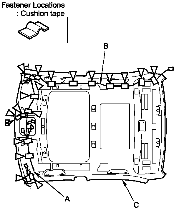 19. If necessary, remove the cushion tape fastening the roof wire harness (A) and the antenna lead (B) to the headliner (C), then remove them from the headliner.