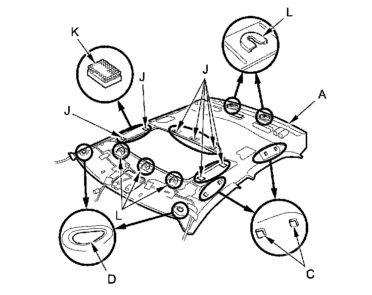 - Any fastener bases (J), the Velcro fasteners (K), or the clip bases (L) which have come off the headliner