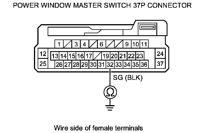 7. Check for continuity between power window master switch 37P connector terminal No. 32 and body ground.