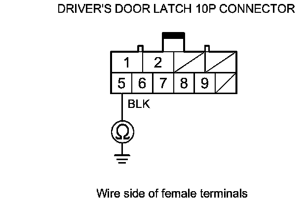11. Check for continuity between driver's door latch 10P connector terminal No. 5 and body ground.
