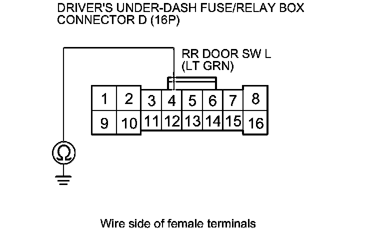 8. Check for continuity between driver's under-dash fuse/relay box connector D (16P) terminal No. 4 and body ground.