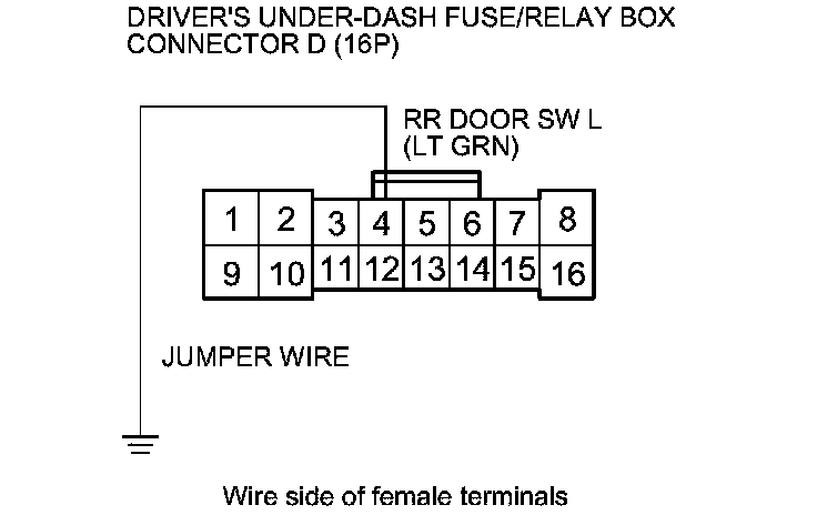 12. Connect driver's under-dash fuse/relay box connector D (16P) terminal No. 4 and body ground with a jumper wire.