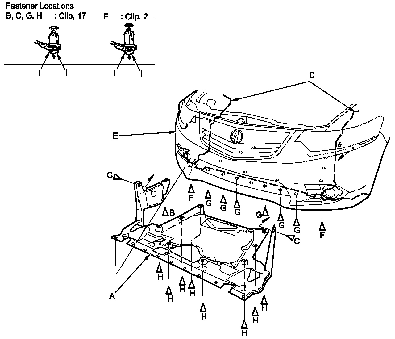 3. From under the front bumper (E), detach the clips (F) securing the front bumper, the front inner fender, and the front splash shield to the body.