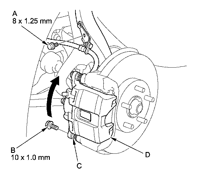 4. Remove the flange bolt (B) while holding the caliper pin (C) with a wrench. Be careful not to damage the pin boot, and pivot the caliper body (D) up out of the way. Check the hose and pin boots for damage and deterioration.