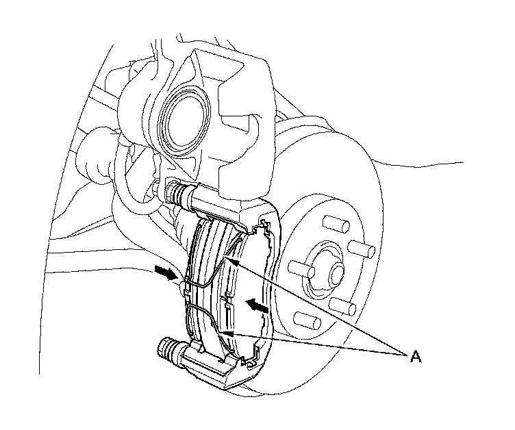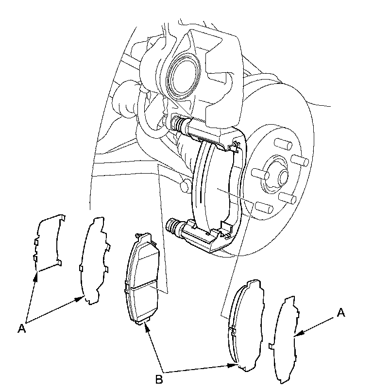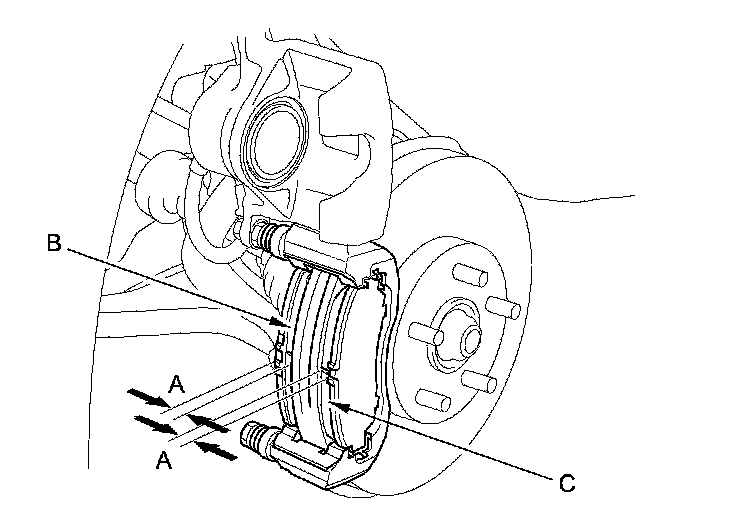 5. Check the thickness (A) of the inner pad (B) and the outer pad (C). Do not include the thickness of the backing plate.