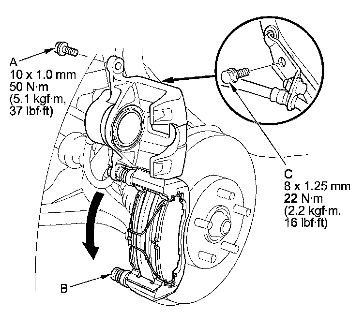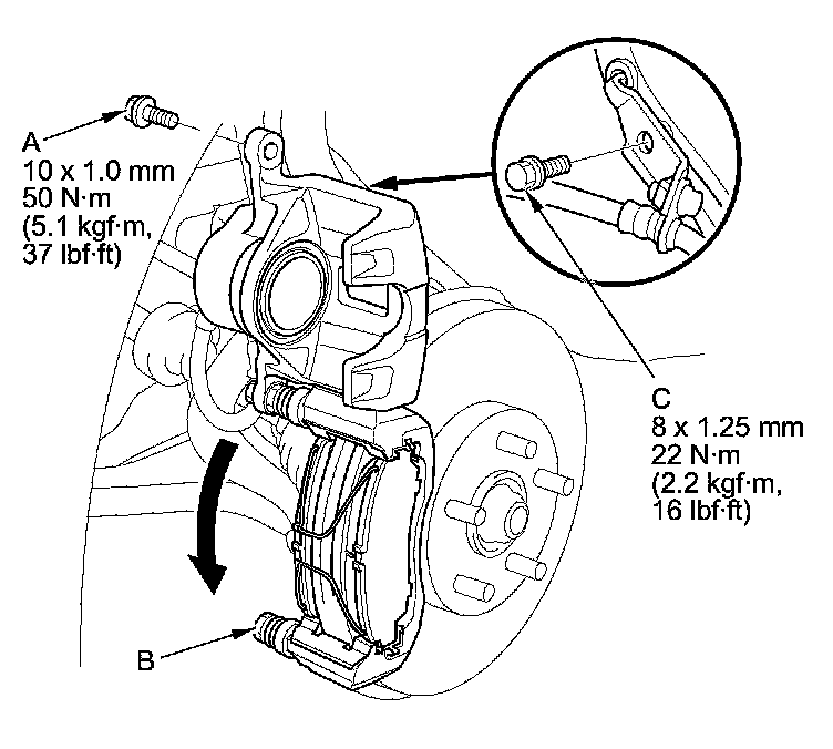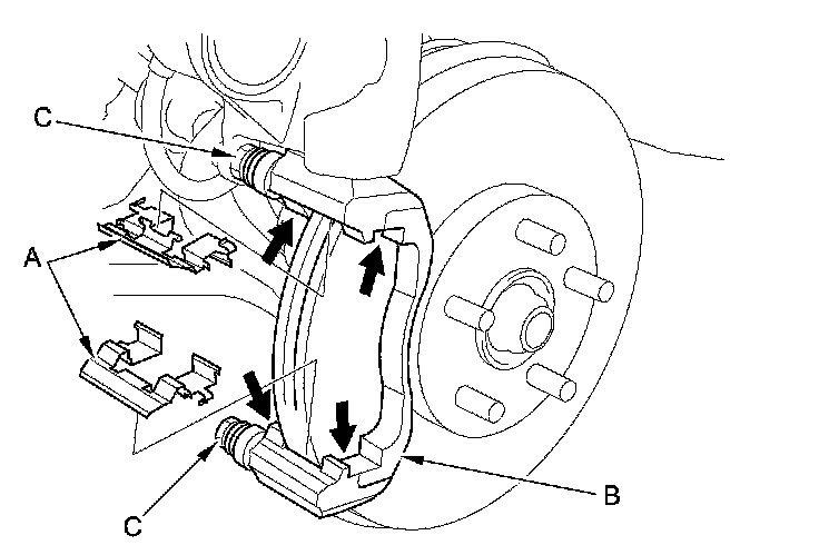 Verify that the caliper pins (C) move in and out smoothly. Clean and lube if needed.