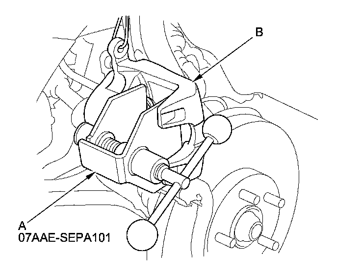 13. Install the brake caliper piston compressor tool (A) on the caliper body (B).