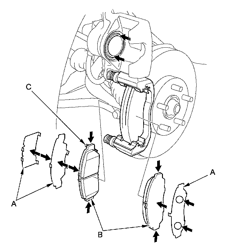 17. Install the brake pads and the pad shims correctly. Install the brake pad with the wear indicator (C) on the upper inside position. If you are reusing the brake pads, always reinstall the brake pads in their original positions to prevent a temporary loss of braking efficiency.