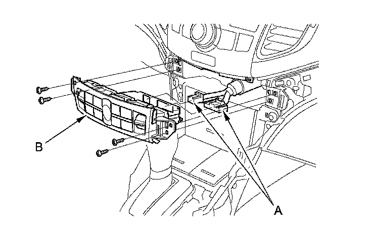 4. Remove the self-tapping screws. Disconnect the connectors (A), then remove the climate control unit (B).