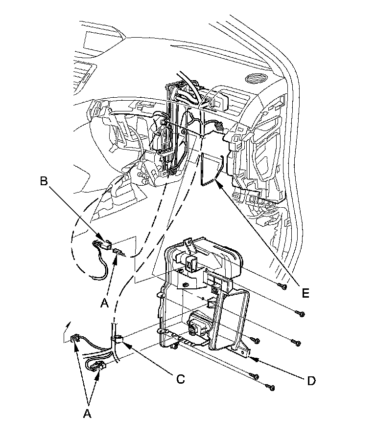 5. Disconnect these connectors (A): The evaporator temperature sensor, the power transistor, and the passenger's air mix control motor. Detach the connector clip (B) and the harness clip (C). Remove the self-tapping screws, the joint duct (D), and the seal (E).
