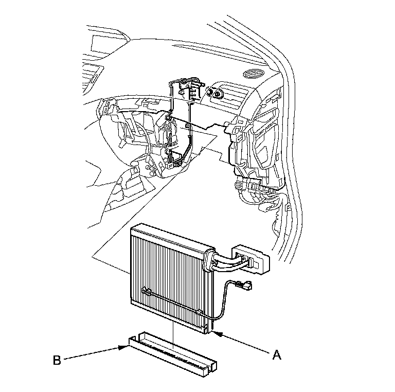 6. Carefully pull out the evaporator core (A) without bending the lines, then remove the plate (B).