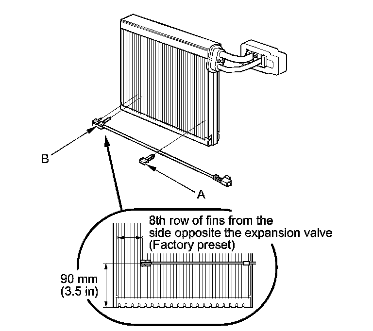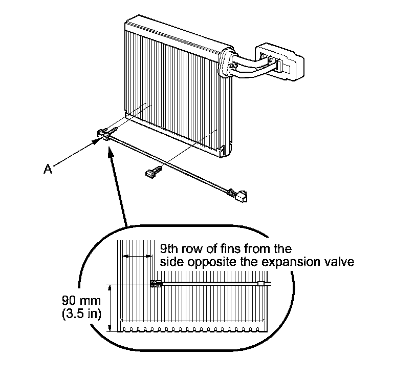 8. When the evaporator temperature sensor (A) is reinstalled onto a new evaporator core, set the evaporator temperature sensor in the 8th row of fins from the side opposite of the expansion valve.