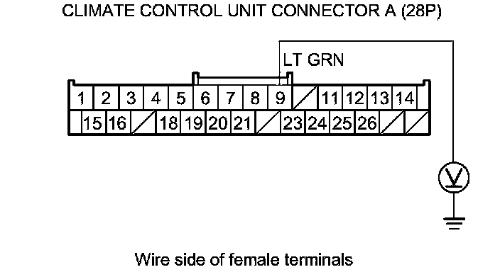 4. Measure the voltage between climate control unit connector A (28P) terminal No. 9 and body ground.